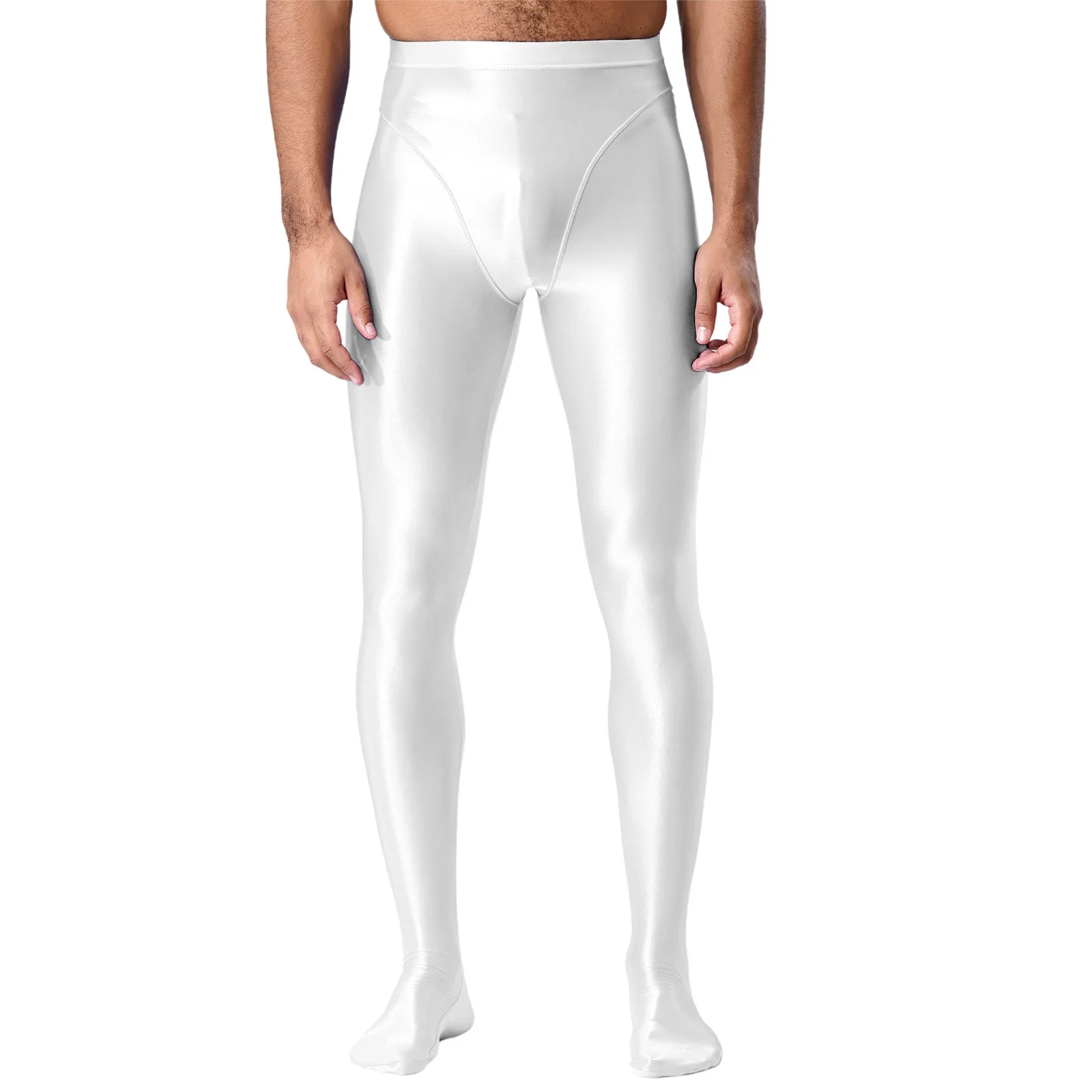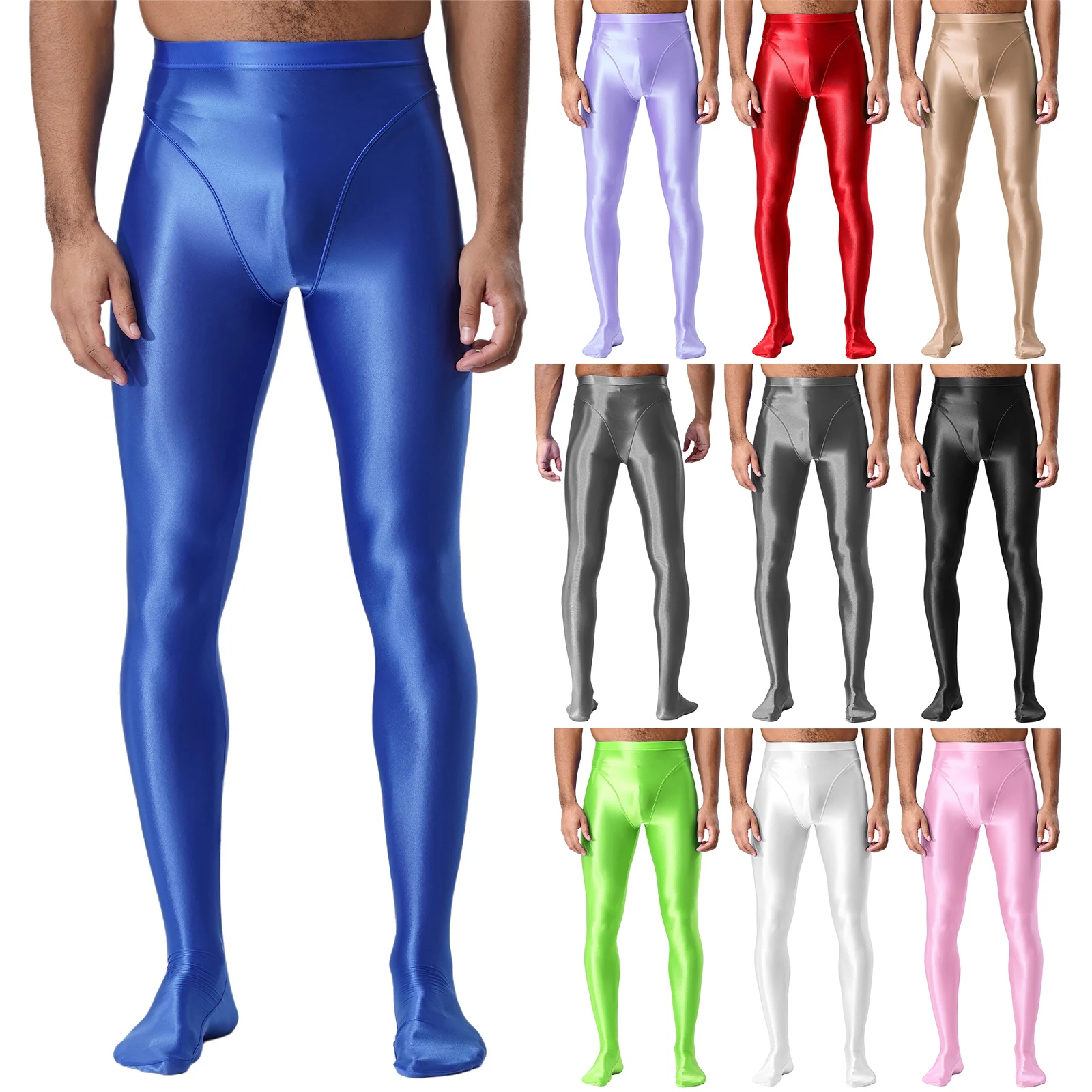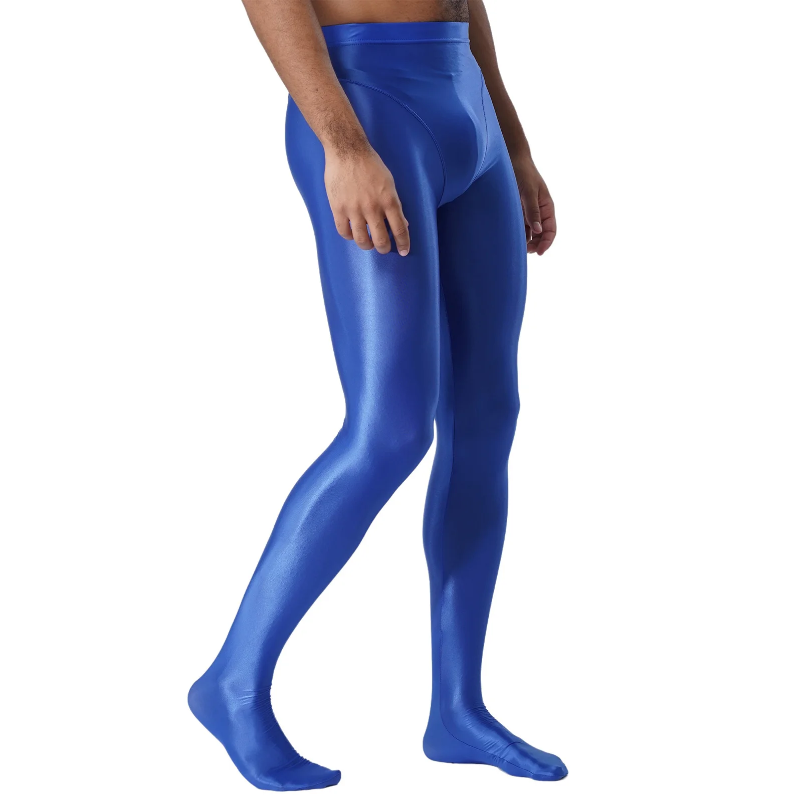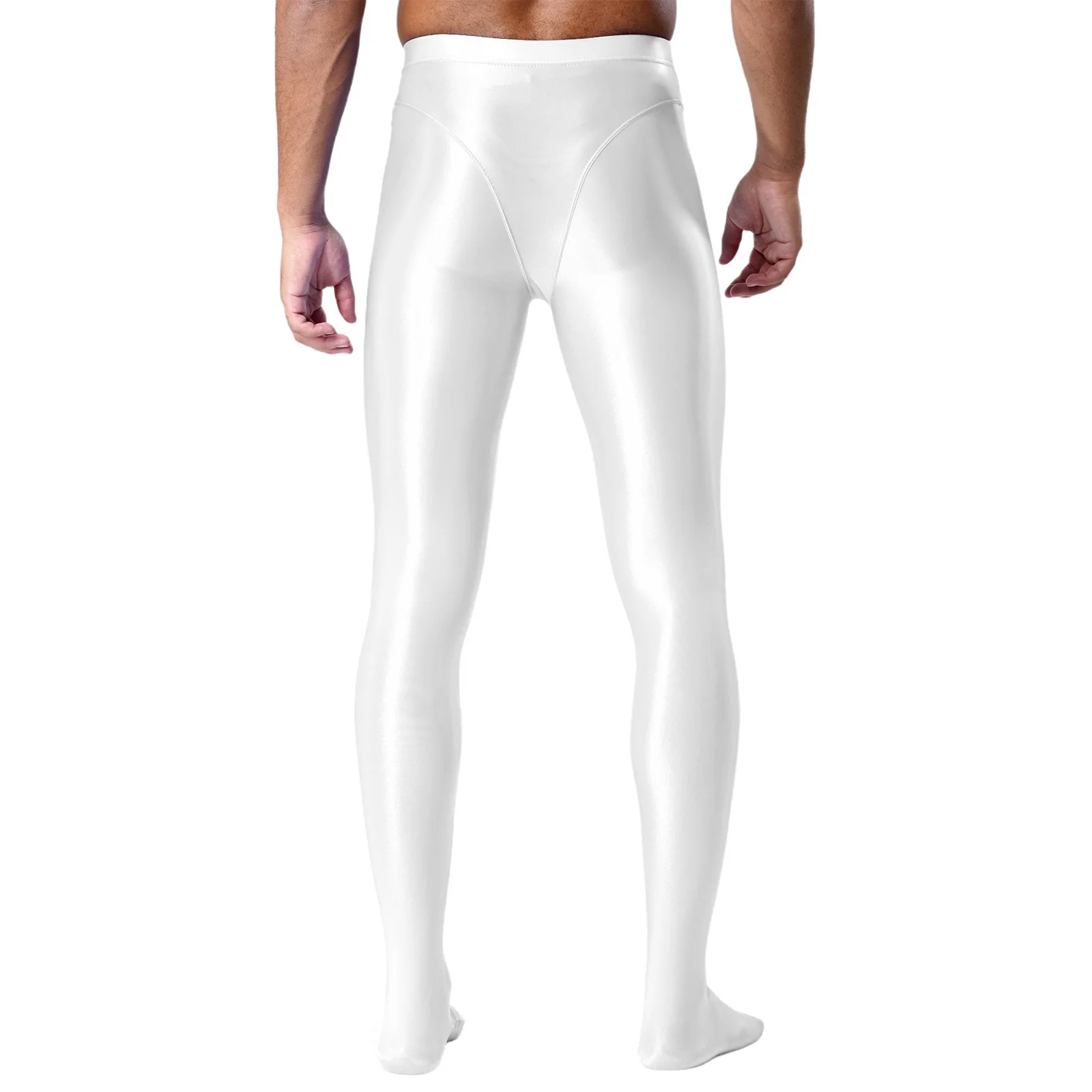 Men Gym Pilates Workout Leggings Glossy Shiny Smooth Elastic Waistband Footed Leggings Tights Slim Fit Sport Exercise Underpants