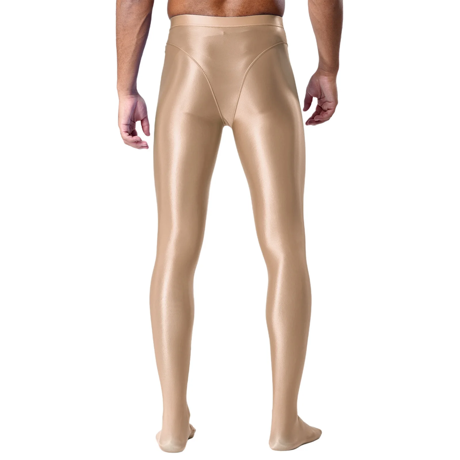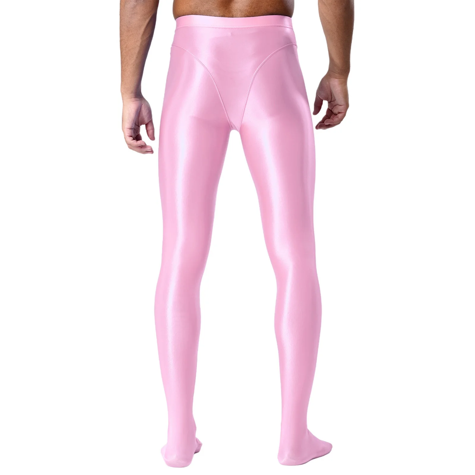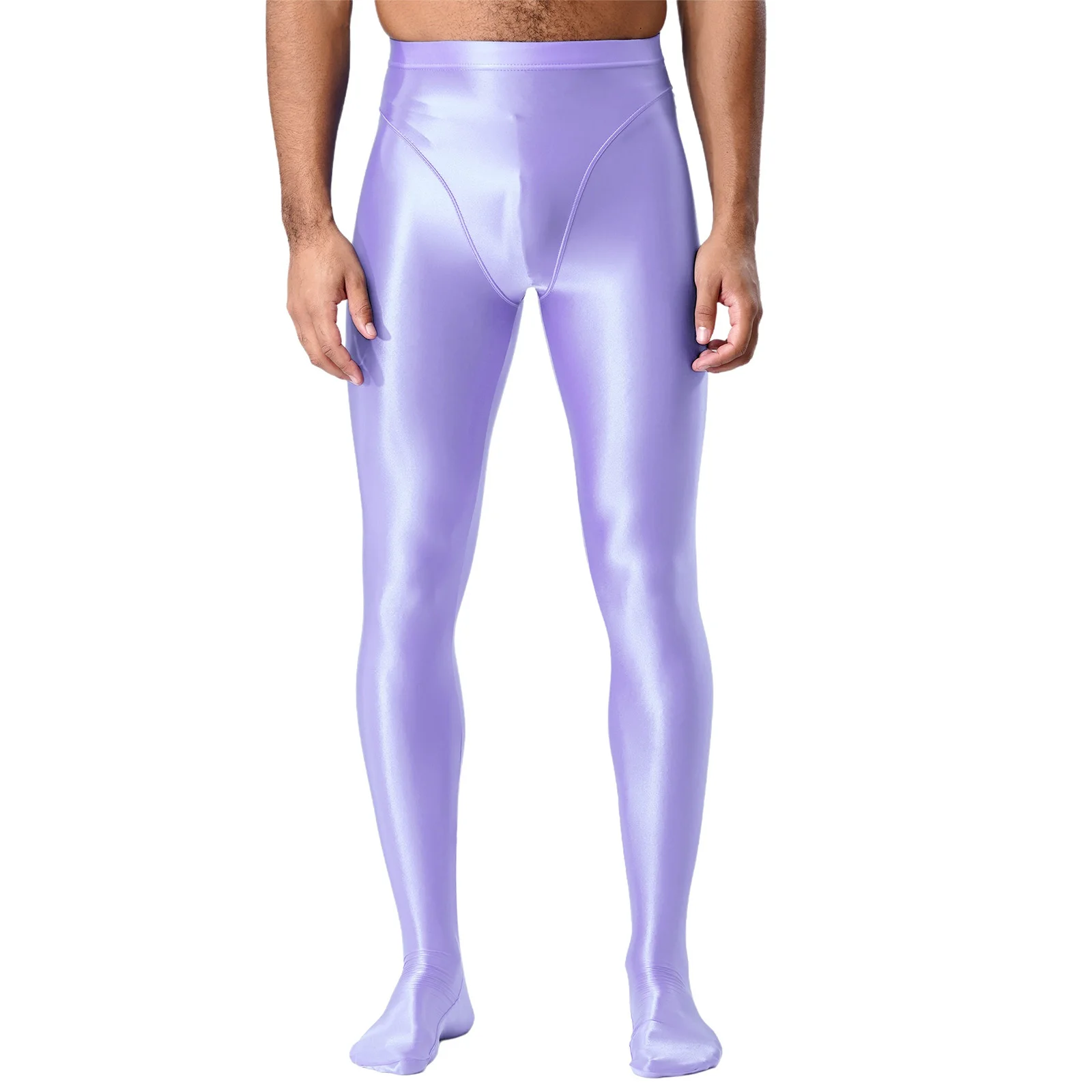 Men Gym Pilates Workout Leggings Glossy Shiny Smooth Elastic Waistband Footed Leggings Tights Slim Fit Sport Exercise Underpants