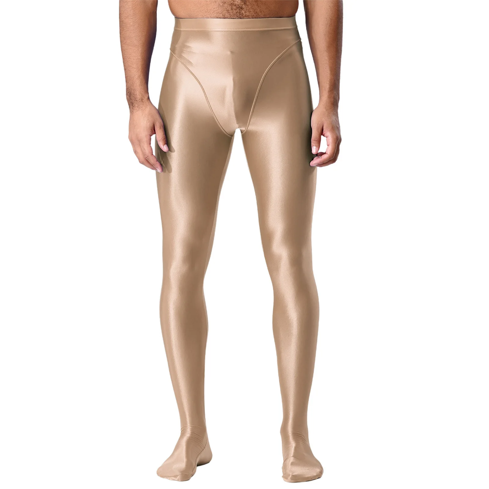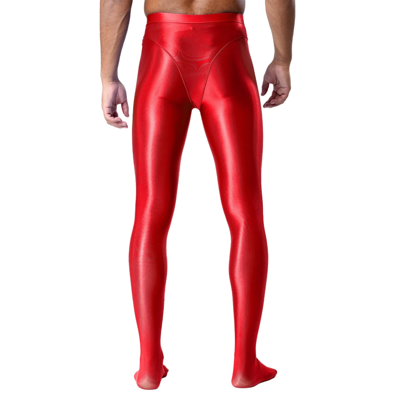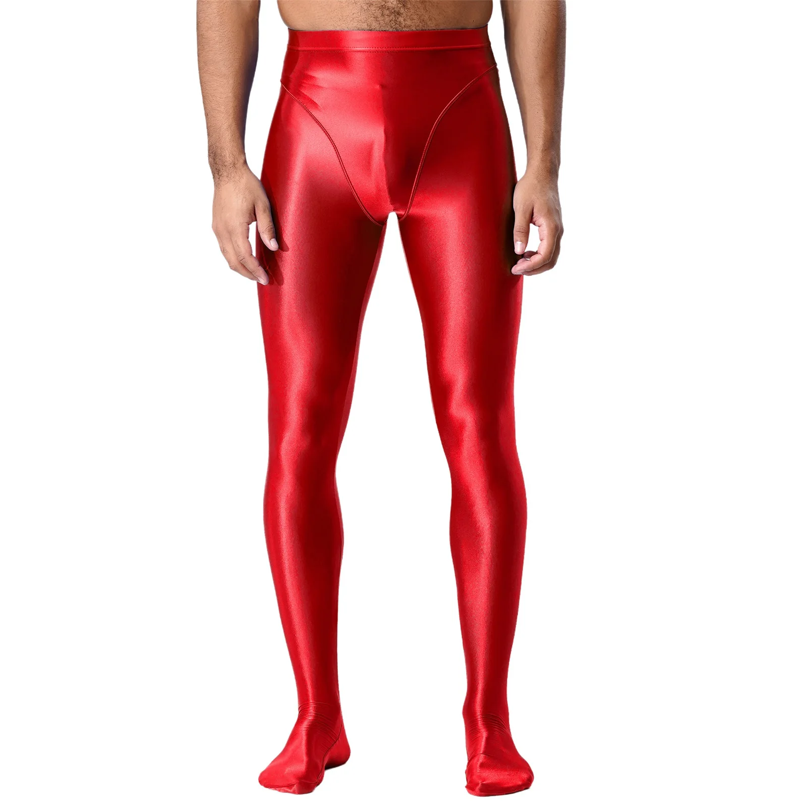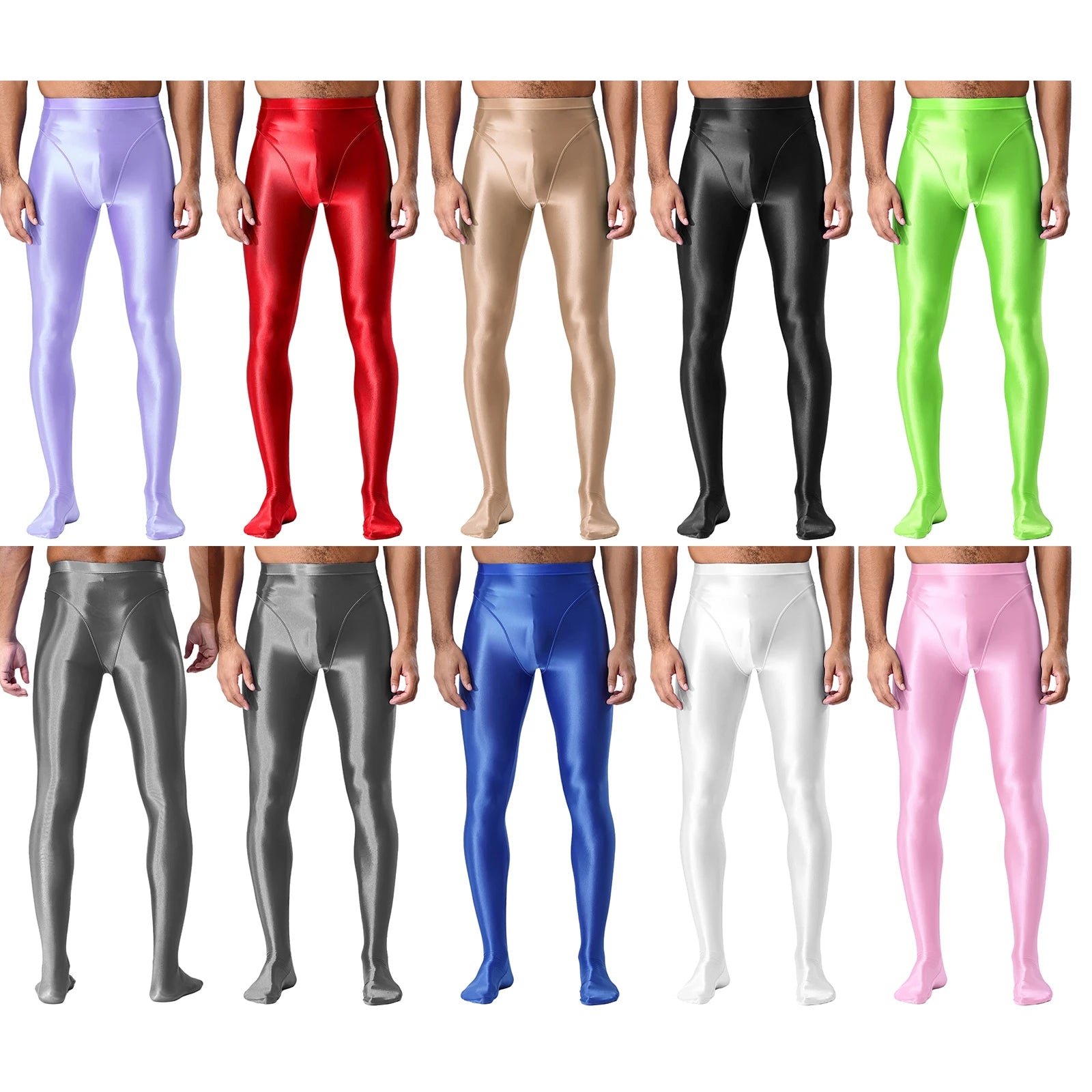 Men Gym Pilates Workout Leggings Glossy Shiny Smooth Elastic Waistband Footed Leggings Tights Slim Fit Sport Exercise Underpants